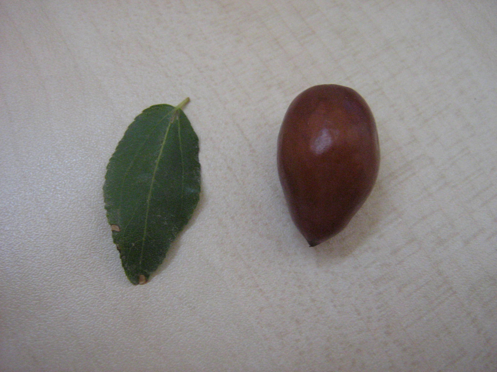 אני מצרף תמונה של עלה ופרי. אין לי תמונה של העץ עצמו, אלא ממה שהחברה שלי נתנה לי צילמתי על השולחן שלי עלה ופרי. הפרי הוא בגודל של זית.
