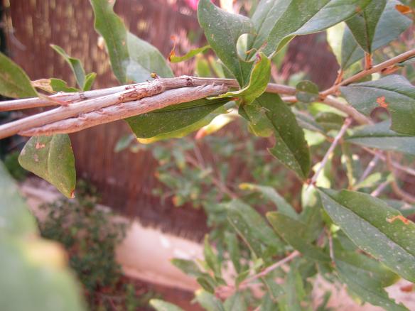 היום שמתי לב לזחל המסווה היטב הזה על עץ הרימון. אני מאמין שהוא מקור העלים האכולים על העץ אבל בכל מקרה מעניין אותי בשביל הידע לדעת איזה סוג של זחל זה.