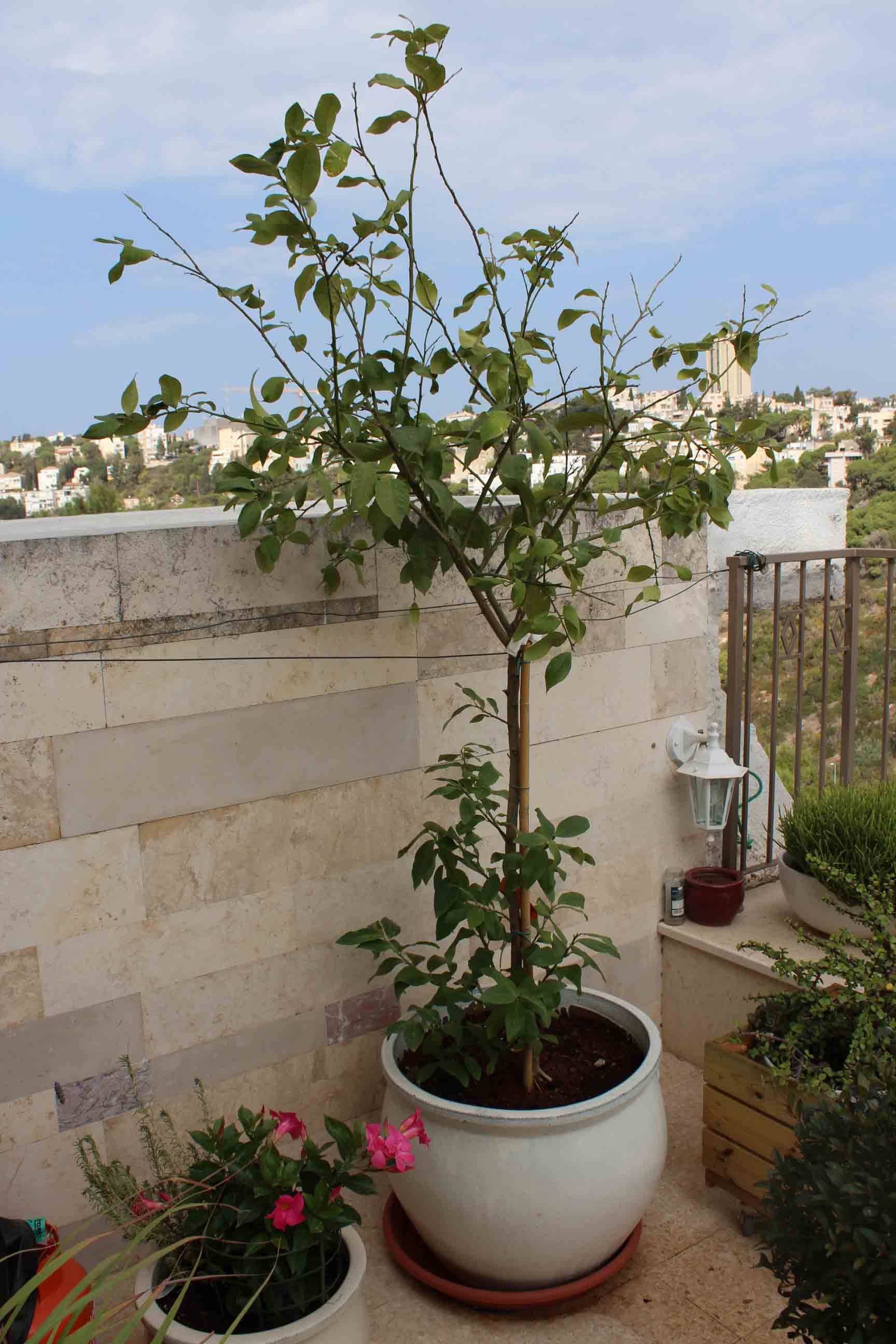 העץ עומד במרפסת בתוך עציץ גדול.