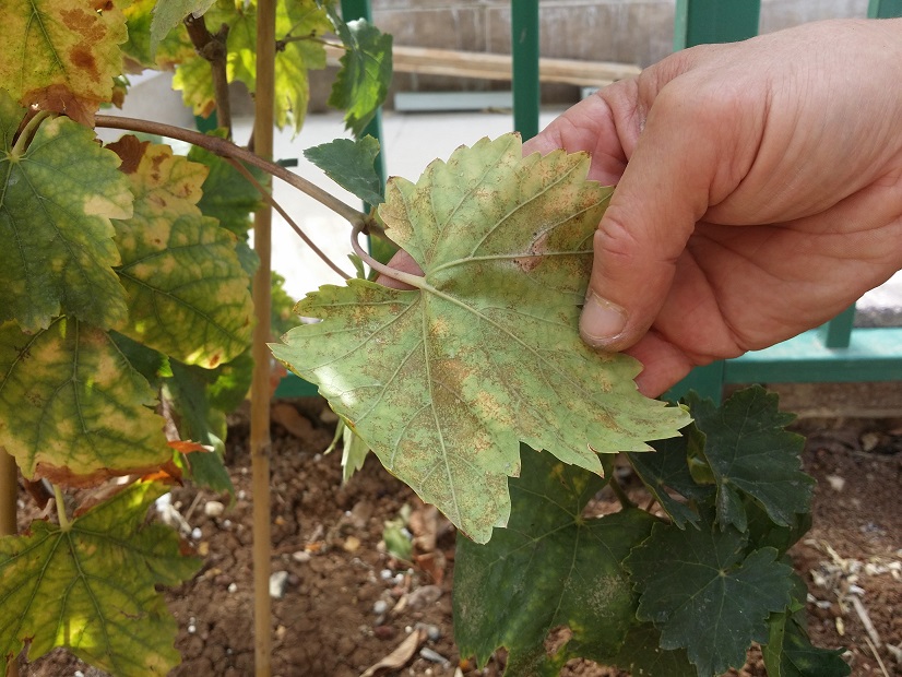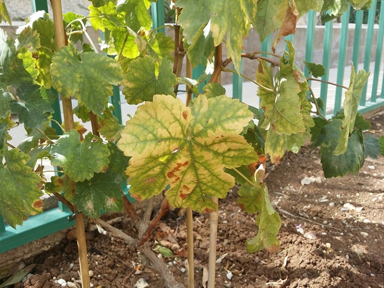 2) למה עם אותה כמות השקיה ,בגפן שליד אין אפילו זכר לעלים צהובים.