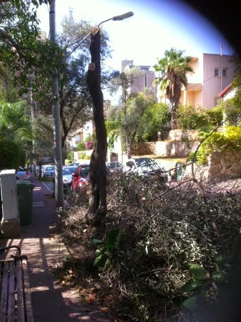 השנה (2014), בסוף הקיץ, נִסְּרוּ בּוּרִים אֵלּוּ אֶת עַנְפֵי הָעֵצִים בשדרה לארך הרחוב בו אני גר, נסור חריף ביותר ולְלֹא כָּל צֹרֶךְ, סתם להפגין. זמן הגזום היה הכי פחות מתאים - לִפְנֵי רֶדֶת מוּעֲקַת הַקַּיִץ (שהשנה היתה כבדה) ולפני בא החרף. יְדוּעַ-אַכְזָבָה משנים קודמות, לא טרחתי לכתב לראש העיריה יונה יהב, משום שכאשר כתבתי לו בענין זה בדיוק לפני שנים אחדות, ענתה לי בשמו אֵיזוֹ אַחַת בְּשֵׁם מָרִיָה, וטענה "שֶׁלֹּא מָצְאָה עִילָה בַּחֹק לְשַׁנּוֹת נֹהַל זֶה". היא חתמה כעו"ד במשרד ראש העיריה.