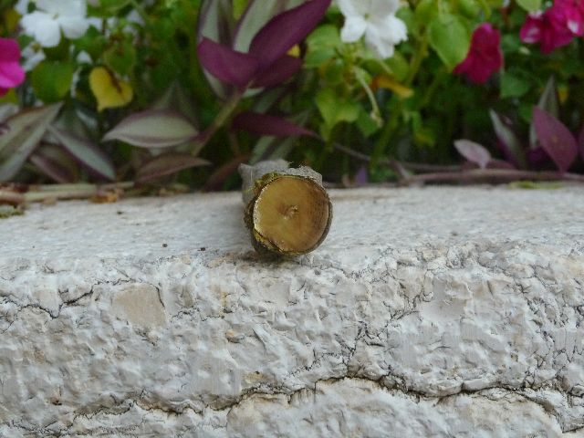 מאחרי התיבשות הענף עלול לעמוד בעיקר אחד משני גורמים נבדלים: א - נובר גזע בשם Celosterna scrabrator הקודח תעלות ארוכות (60 סמ' ויותר) לאורך ציר הענף ובדרכו הורס את מערכת ההולכה של הענף. התוצאה היא תחילה הצהבה ונשירה של העלווה, ובהמשך מות הענף. לא תבחין במקרה זה בנסורת או קדחים מלבד קדח הכניסה הראשוני שלא יהיה קל למוצאו. ב - הגורם השני הוא מחלת הדוררת הנגרמת על-ידי פטריה שוכנת קרקע בשם Verticillium dahliae. עד לאחרונה הרימון לא היה ידוע כפונדקאי של הפטריה הזו אבל לאחרונה (2008) דווח על פגיעה מסיבית במטעי רימונים ביוון. ככל הנראה נוצרה מוטציה של הפטריה היכולה לפגוע ברימון. כנגד פטריה זו אין תרופה. היא פוגעת בענף מסוים דרך מערכת השורשים המזינה את אותו ענף. בהמשך היא עלולה להתפשט בקרקע מסביב לגזע וכך להוות סכנה לענפים בגזרות האחרות. מאחר שהענף אצלך במילא יבש ומת, נסר אותו במרחק של כ-0.5מ' מתחתיתו. בחן את החתך, האם אתה רואה סימן לקדח המתקדם לאורך הענף? אם התשובה חיובית, הרי שזו פגיעה ע"י נובר הגזע. אם אין סימן לתעלה אורכית, בדוק היטב את החתך לרוחב הענף. האם אתה מבחין במעין טבעת כהה בתוך העצה של הענף המנוסר? אם כן, זו פגיעת הפטריה הנ"ל. אם החתך נקי לחלוטין מכל כתמי צבע כהים חומים/שחורים המשך לנסר את הענף כדי לחפש את תעלת הנובר בהמשך הדרך, או סימנים כנ"ל לפטריה. שוב לכאן עם תאור מה שמצאת להמשך הנחיות טיפול.
