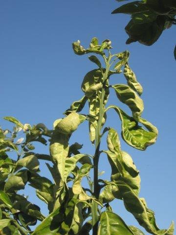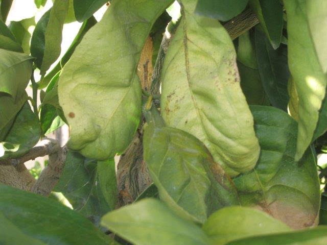 בשבועות האחרונים בנוסף לעלים המקומטים שבקצות הענפים הופיעו עלים עם כתמים לבנים וחומים.