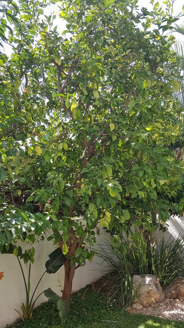 הצבע של עלי עץ הלימון הוא ירוק בהיר - צהבהב. העץ הניב הרבה לימונים בעונה שעברה וגם עכשיו יש הרבה לימונים קטנים.