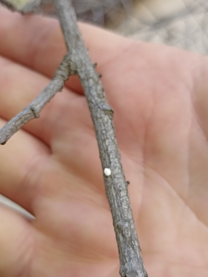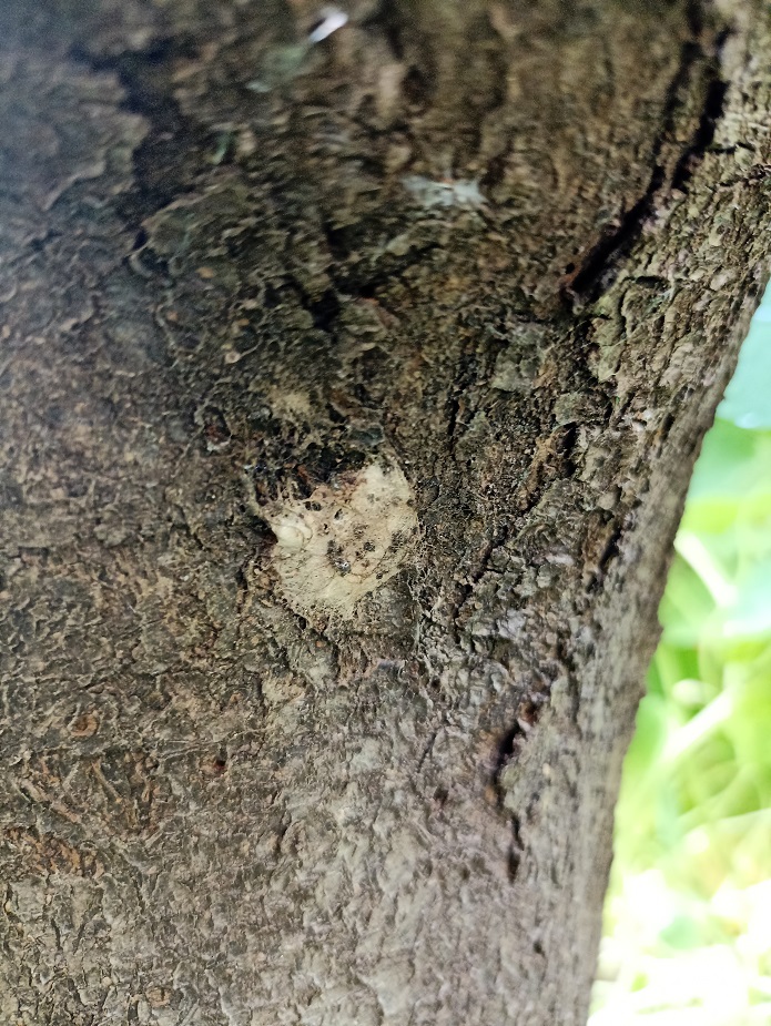 במספר מקומות קליפת הענפים מתקלפת ונראית אבקה בצבע חום אדמדם. כמו כן יש מספר מוקדים של חומר לבן דמוי קורי עכביש שנראים כמו פקעת הטלה של עכביש.