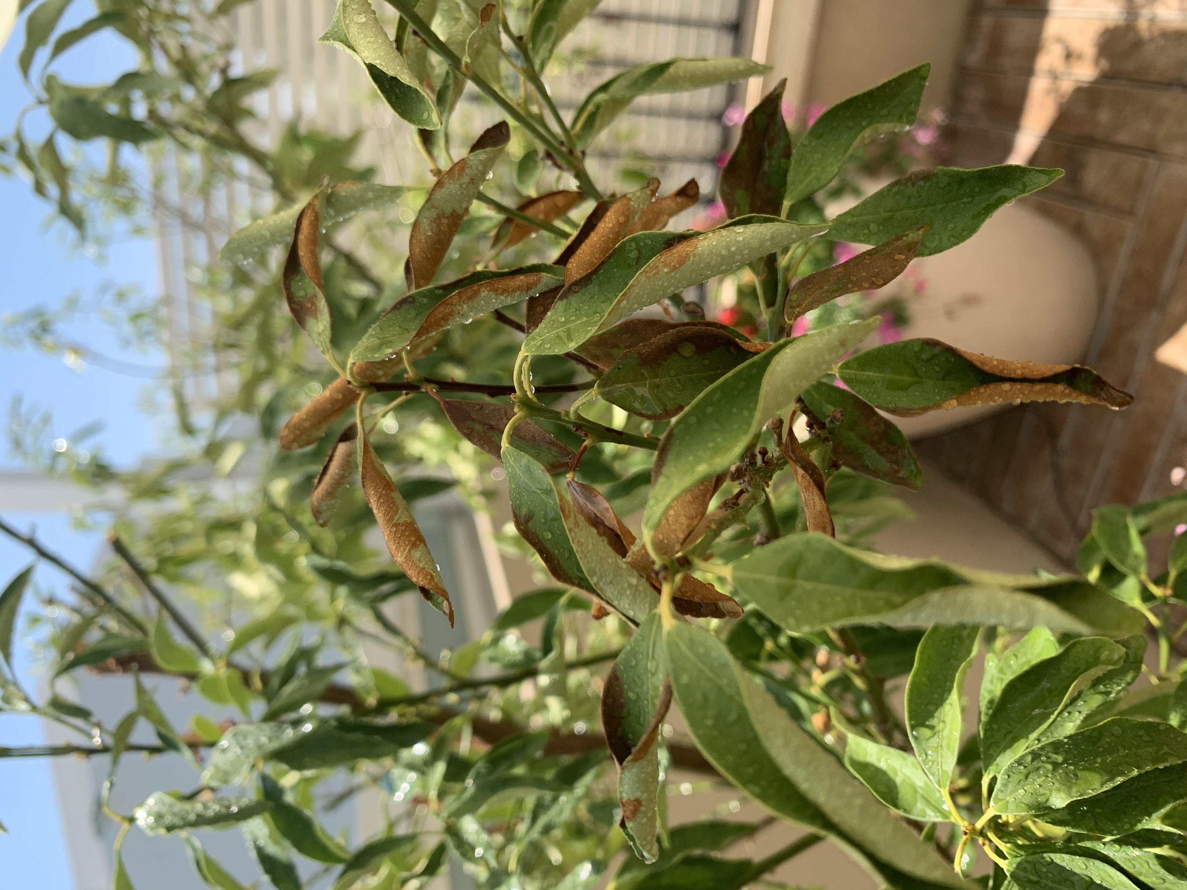 בעץ הלימון הננסי שממוקם ממש בסמוך לתפוז הסיני החלו העלים להשחים ולנשור.