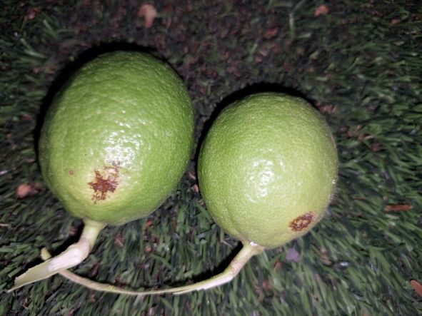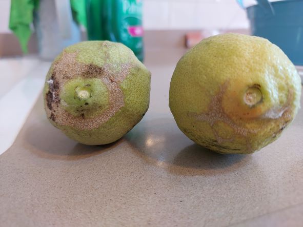 עץ לימון שנתן את הפירות הראשונים שלו, בכל הפירות יש איזשהו נגע. (הסימון השחור על הלימון הימני למטה, זה סימון בטוש, שסימנתי את הפירות שהן עדין ב03 שנים הראשונות).
