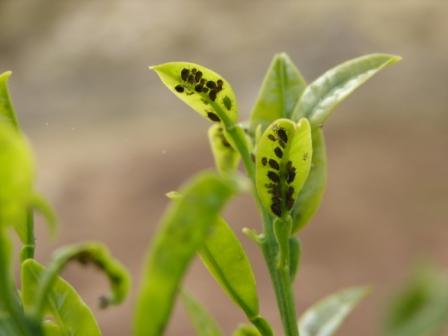 יש לי עץ תפוז מזן ולנסיה , לפני כחודש העץ החל להוציא פריחה של עלים קטנים על העלים ישנם המון פרעושים קטנים שחורים ,מצ"ב תמונה