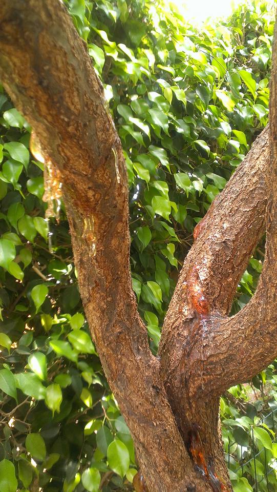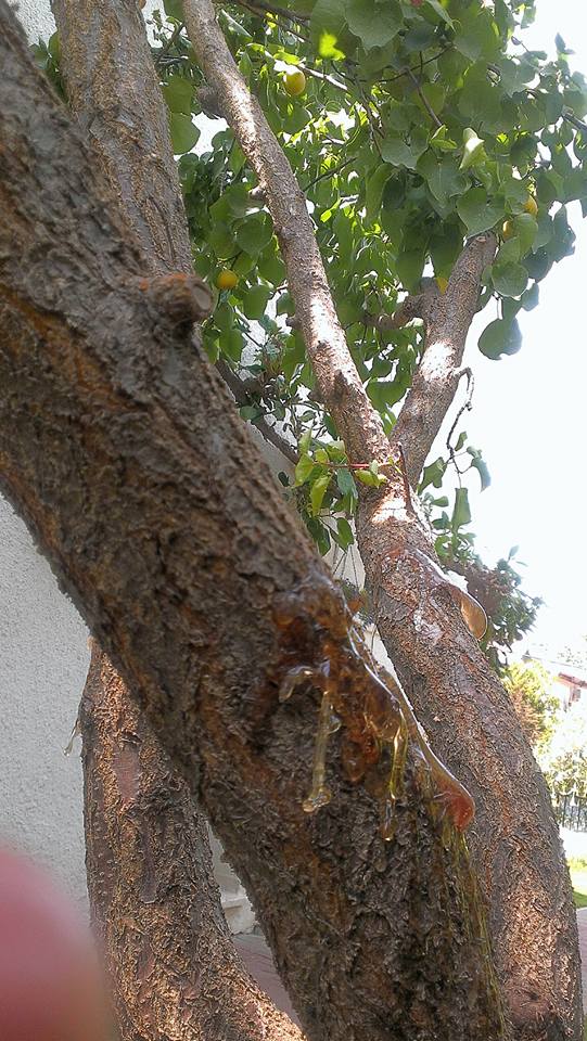 מישמש הוא עץ לא קל לטיפוח. רגיש מאוד לגורמי מחלות. העץ שלך נתקף על ידי מחלת כיב הציטוספורה הנגרמת על ידי הפטריה Leucostoma persoonii. העץ נדון למוות, אבל לא מיד, אלא בתוך 4-8 שנים מיום שהחל השרף לשפוע. סיכוי קטן שיצליח להתגבר בכוחות עצמו. אם את רוצה לנסות לעזור לו סלקי באמצעות סכין חדה את הקליפה מסביב לכל נקודת שפיעה ובקוטר כזה שיכיל את הכתם הכהה על העצה מתחת לקליפה. הקפידי לטבול היטב את הכלי במי כלור (אקונומיקה) בין חיתוך אחד למשנהו, כדי לא להעביר את המחלה לאזורים בריאים. את האזור החשוף רססי היטב בתמיסה של 0.5% מלח נחושת כלשהו (קוסייד, קופרוקס, קפטן ודומיהם) וכסי מיד במשחת עצים. איני מבטיח לך הצלחה, בעיקר לאור המצב הנראה של ריבוי נקודות פגיעה. חשוב להשקות היטב ובאופן סדיר כל עוד העץ נאבק בגורם המחלה. מאחר שהשרף צלול, אין זה מקרה של נובר גזע או נובר קליפה כלשהם. כאשר השרף מקורו במתקפה של נוברים כאלה (זחלי עשים), השרף לרוב מעורב בנסורת הנוצרת כתוצאה מהנבירה.