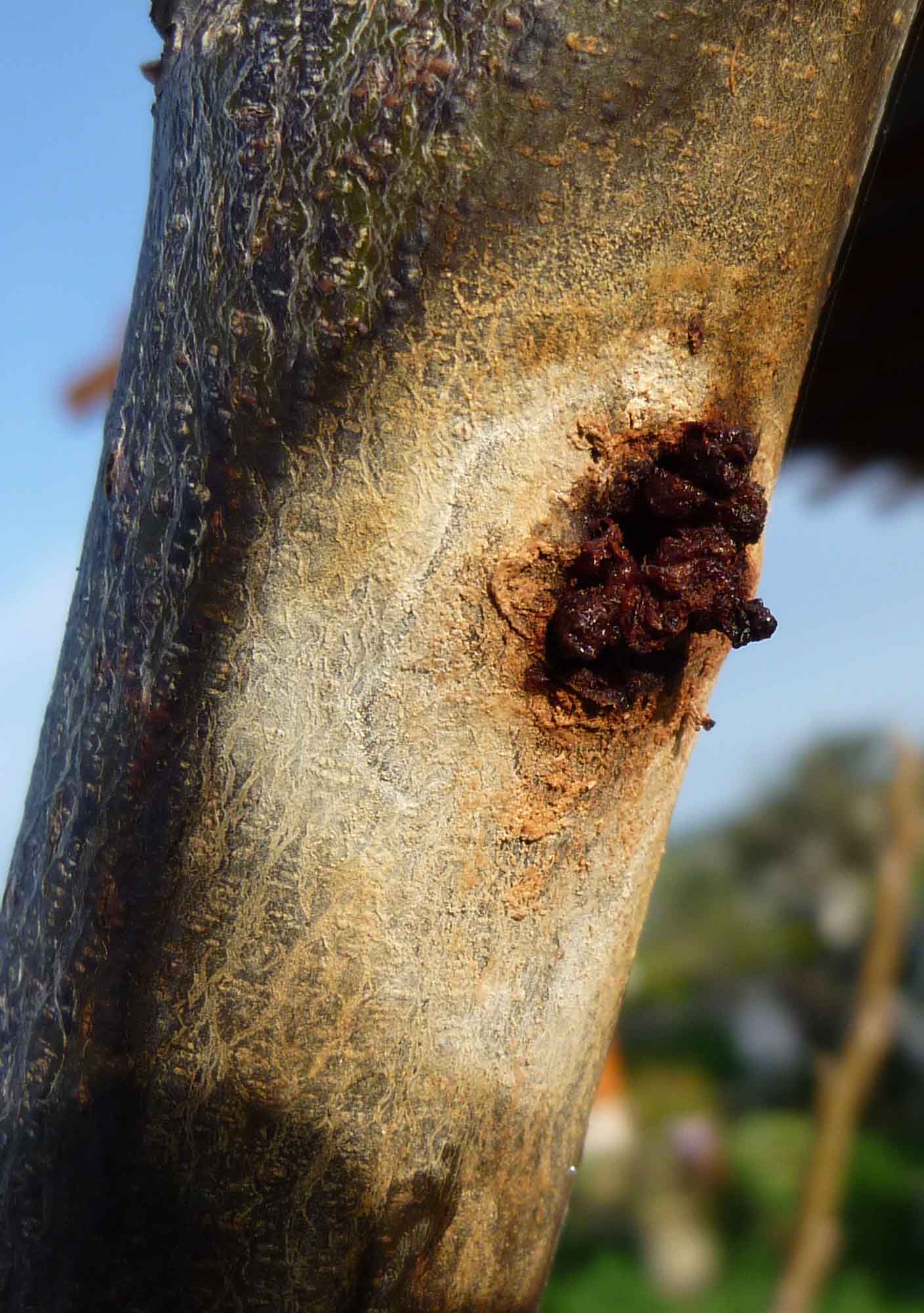 התמונה מראה משהוא שנראה ככיב/פצע בגזע העץ. סיבה אפרית למשל: חדירה של נובר גזע כלשהוא וגם לאחר שיצא,נשאר הפתח כמקום נוח לחדירת מחלות. מה לעשות: לנקות הפצע ע"י סילוק החומר החום שרואים. לוודא אם יש חור המשך לתוך העץ. אם אין אז לחטא את הפצע,אפילו בסבון או אקומיקה. לחזור על כך מידי פעם עד שתווצר הגלדה. אם יש חור ,לנקותו בעזרת חוט פלדה.למא לתוך החור צמר גפן טבול בחומר נדיף כלשהוא. לאטום בשעווה או פלסטלינה. ההמשך ,לחכות להגלדה.