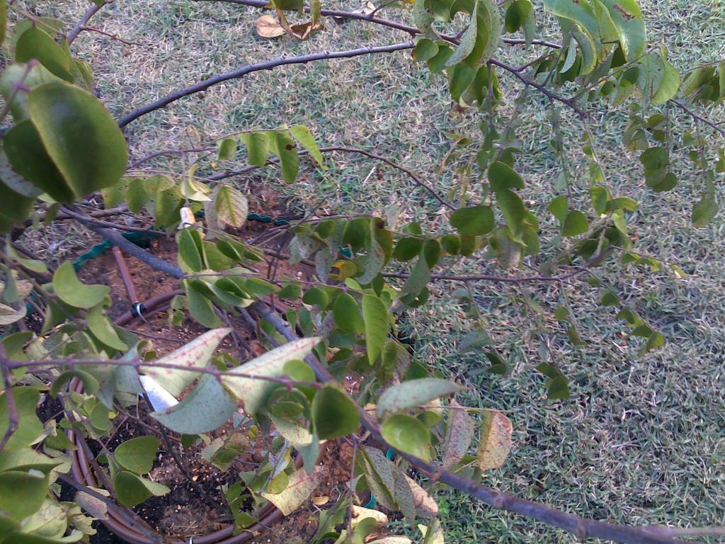 לפני כחודש שתלנו קרמבולה העלים נראו עם מנוקדים באדום חום ומעט מקומטים , לדברי המשתלה "עדיין תלאות החורף"