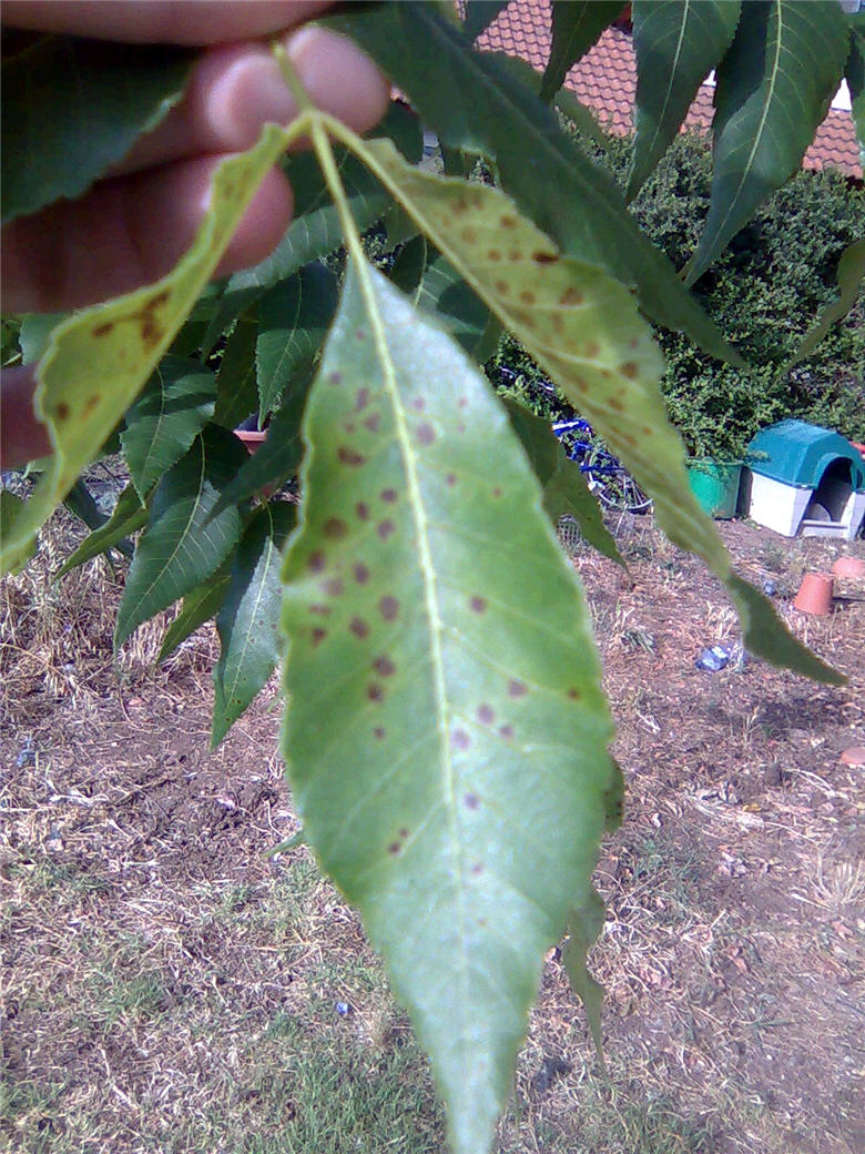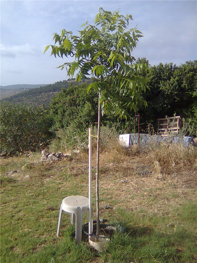 לפי מופע העלים העץ נפגע במחלה פטריתית מאוד נפוצה בעצי פקאן. שמה הוא גרב הפקאן (Pecan scab) והיא נגרמת על-ידי הפטריה Cladosporium caryigenum. למען האמת אני מתלבט מה לייעץ לך. הטיפול כרגיל הוא במרקחת שלמה של חומרי הדברה, ביניהם דקוניל, שאינם מותרים לשימוש בגן הביתי. למזלך, העץ עדיין צעיר ולכן לא היתמר לגבהים אופיניים לו, וכך תוכל לרסס אותו בלי בעיות. נסה ריסוס בתמיסות מלחי נחושת, בורדזול, קופרוקס, או קוסייד. הכן תמיסות של 1% ורסס אחת לשבוע במהלך כל הקיץ. הקפד על הרטבה מלאה של העלים. אל תגזום את העץ. כנראה שהמחלה פרצה עקב פצע גיזום. דווח לנו כאן על תוצאות הריסוס לאחר הריסוס הרביעי. במקומו הטבעי פקאן יושב על מי תהום או לגדות נהרות. הוא זקוק לאדמה עמוקה מאוד ולהרבה מים. ההתרשמות שלי היא שהוא נטוע לא בדיוק בסביבה מתאימה לו. לכן, הקפד על השקיה מוגברת, פעמיים בשבוע 70-80 ליטר בכל פעם. העלה את הכמויות עם התקדמות הגיל. הגש את המים בטיפטוף איטי כך שיקח 4-5 שעות עד להגשת הכמות החצי-שבועית. סלק את כל העלים שנושרים ארצה ממנו. הפטריה שעליהם תשוב לתקוף אחרי החורף הבא. סלק גם את העלים שעדיין לא נשרו אך הם פגועים במיוחד.