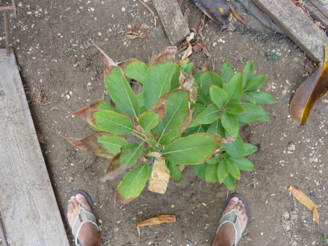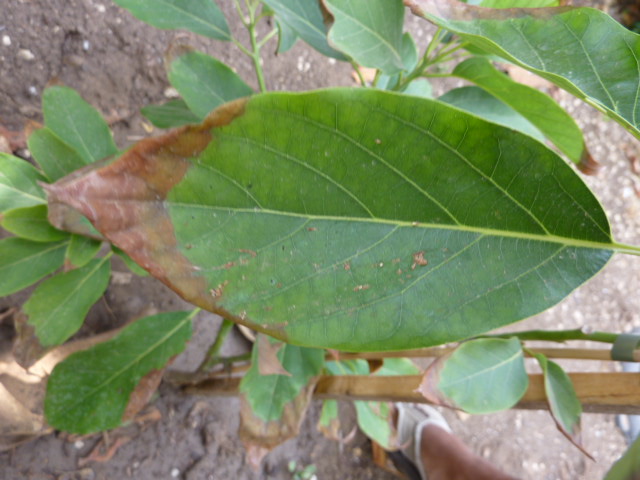 אלה סימפטומים טיפוסיים של מחלת ריקבון השורש הנגרמת על-ידי פטריה שוכנת קרקע בשם Phytophthora cinnamomi. המחלה פורצת באדמות בלתי מנוקזות עם משטר השקיה לא נכון. באדמה כזו חשוב להשקות בטיפטוף כאשר הכמות המומלצת מסופקת במשך זמן ארוך במיוחד. בגידול מסחרי עץ בוגר מקבל לפחות 200 ליטרים מים בכל יום!!! לעץ הקטן שלך אפשר להסתפק ברבע הכמות הזו, אך אם הקרקע אומנם כה בלתי מנוקזת יתכן שחבל על המאמץ. מרגע שהמחלה פורצת קשה עד בלתי אפשרי להפטר מהפטריה בקרקע. אם העץ ימות, וכך קורה לרוב, חשוב לסלקו מהמקום יחד עם כל עלווה שנשרה ואת הקרקע לחטא באופן סולרי. קרא על שיטת חיטוי זו בחיפוש באתר. הסברנו את הדרך הרבה מאוד פעמים. מכל מקום, טיפול הדברתי בגידולים מסחריים נשען על שימוש בנגזרות של חומצה זרחתית כגון אלייט ורידומיל. אלה אינם חומרים לשימוש ביתי. אתה יכול להמתין עונה ולראות אם העץ משקם את עצמו בעקבות הנהגת משטר השקיה זהיר. אם הצימוח החדש ימשיך להראות את אותם סימני פגיעה, הרחק את העץ בהקדם ואל תשתול במקומו דבר אלא לאחר חיטוי השטח.