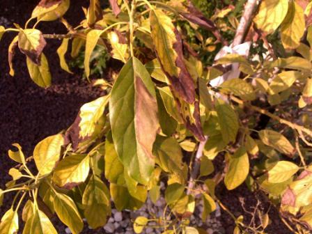 עץ האבוקדו שבגינתי נראה במצוקה. העלים מצהיבים ונראים "שרופים" בקצוות ובהיקף. כמו כן הופיעו לאחרונה כתמים חומים שנראים כמו צריבה בענפים.