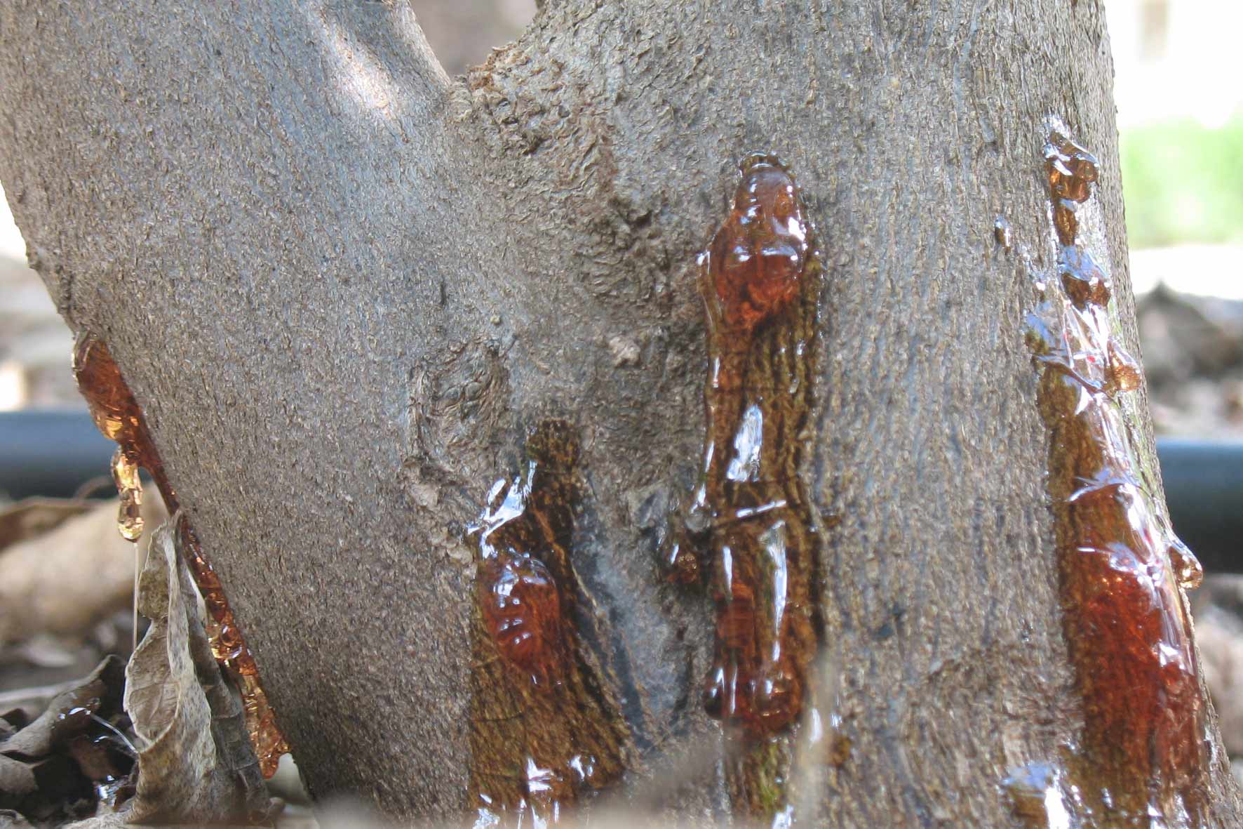 התמונה הנוספת מאששת את האיבחון. לא כל העלווה מצהיבה בבת אחת. התהליך איטי וילך ויתדרדר עם הזמן עד לחיסולו של העץ. כמו כן, בהגדלה רואים בתמונה המקורית, לצד נזילת השרף, ראשית התבקעות הקליפה. כאשר כתבתי 'סדקים' לא היתה הכוונה לחריצי עומק, דמוי פיצוצים בגזע, אלא לדברים כאלו בקליפה. הסיבות למה שאתה רואה, שלוש: (1) כנה לא מתאימה; (2) קרקע לא מנוקזת דיה (היכן אתה גר, מה טיפוס הקרקע במקום?); (3) השקית העץ, או סביבתו כגון מדשאה וכו', נעשתה באופן שגוי כך שהרטיבה את הגזע פעם ועוד פעם. לבסוף נתקף העץ בפטריה. אין חובה שכל הסיבות היו קימות, די בכל אחת מהן להביע להתקפת הפטריה.