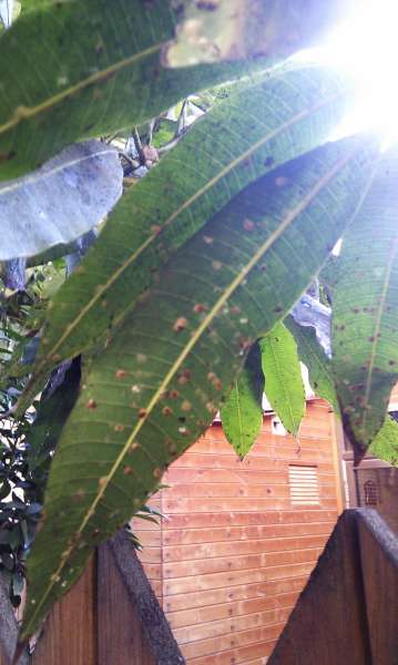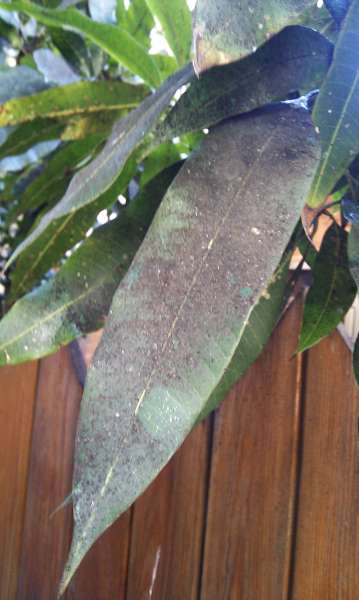 עץ המנגו שלנו תפס גובה רב. הוא נותן פריחה רבה אבל הכל נושר ולא מתפתח פרי. בנוסף יש נגעים או מן פחמון על העלים.