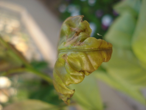 התמונה מאוד לא חדה וברורה. עלים ופרי מעוותים בצורה זו עלולים להעיד על מתקפה של אקרית הניצן. חרק זעיר בגודל עשירית המילימטר שכמעט לא ניתן לראותו בעין. האקרית מוצצת את מוהל העץ באזור הניצנים, וכל תא שנמצץ ממנו המוהל מת. תאים מתים לא יתפתחו יותר, כמובן. מה שימשיך להתחלק ולגדול הם רק אותם תאים שלא נפגעו. יוצא מכך שיש אזורים בעלה המתפתחים כרגיל, ואחרים נותרים מתים בעינם וכך נוצר עלה מעוות. דמיין לך בלון שהדבקת כמה פינות משטחים שלו זה לזה. המשטחים המודבקים לא יתנפחו כאשר תנפח את הבלון, אבל המשטחים האחרים יתנפחו כמובן. התוצאה תהיה בלון בעל צורה מעוותת אקראית. זה מה שקורה לעלה במקרה של פעילות אקרית הניצן. רסס עתה את כל העץ, והקפד במיוחד על הניצנים, בנימגארד. חזור על הפעולה אחת לשבוע עד לסוף חודש אפריל. אל תרסס בימים בהם צפוי לרדת גשם.