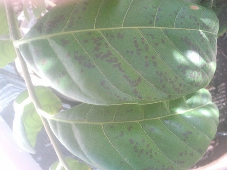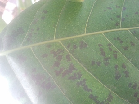 התמונות אומנם לא אומרות הרבה אך תאורך על כתמים במשטח העלה העליון בלבד, יחד עם העובדה שמדובר בלונגן, רומזת לפגיעה על ידי הפתוגן (גורם מחלה) Cephaleuros virescens הידוע בשם "אצה ירוקה". הכתמים נראים תחילה בצבע ירוק-אפור ועם הבשלת המנבגים של האצה הם הופכים לחומים-אדומים ולבסוף משחירים. כל עוד הנפגעים הם רק העלים, הסכנה לבריאות העץ אינה רבה. הבעיה היא שהנבגים נוטים ליצור מושבות אצה חדשים על יתר חלקי העץ. אם מחלת כתמי האצה פוגעת בענפים היא עלולה לגרום למותם ומשם הדרך קצרה למות העץ. הפגיעה בענפים מתבטאת בסדקים הנוצרים בקליפה.