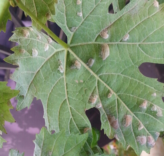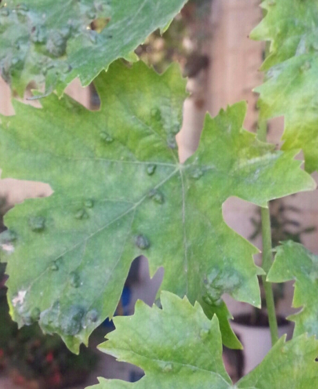 על גבי עלי הגפן נוצרו יבלות של עד 1 ס"מ, כאשר בגב העלים ישנם כתמים לבנים הממוקמים