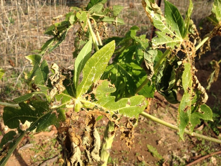בחצר שלנו עץ פפאיה בן כחצי שנה אשר נראה שמישהו מכרסם את עליו בצורה רצינית ביותר (תמונה מצורפת). מה כדאי לעשות והאם זה מסוכן לעץ?