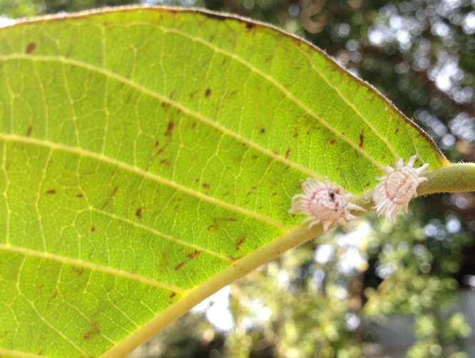 לידו שני עצי אנונה וגויאבה צעירים עם עלים מחוררים ונקודות חומות. שני החברים הלבנים נצפו אף הם על העלים.