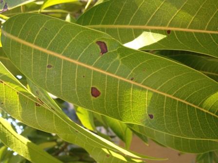 יש לי עץ מנגו בוגר שקיבל עיגולים שחורים על העלים, חלק מקצוות העלים נראים קמלים/ שרופים,