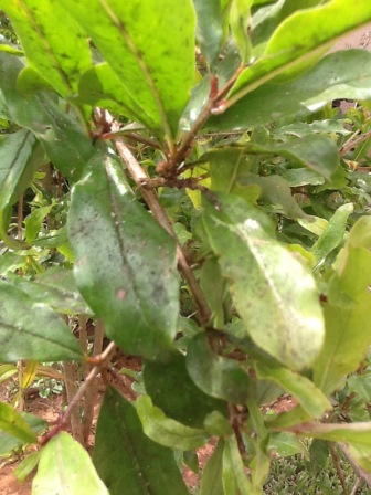 על עלי עץ הרימון נראים כתמים שחורים כעין לכלוך ועליהם ברחשים קטנים שחורים מעופפים ועל העץ מטיילות נמלים.
