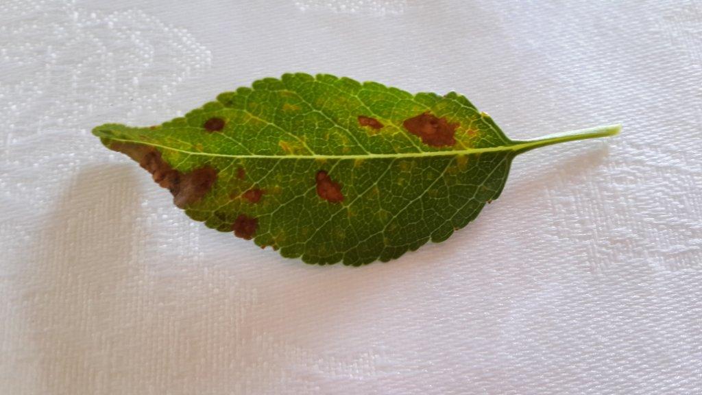 אין זו פגיעה מכנית והעץ עלול שלא להתגבר על גורם המחלה בכוחות עצמו. מדובר, קרוב לודאי, במחלה פטרייתית, אולי זו הנגרמת על ידי פטרית החלפת, אבל אין לפסול גם פגיעה בקטריאלית על ידי הבקטריה Xylella fastidiosa. קביעת הגורם אפשרית רק במעבדה. הרחיקו את כל העלווה הפגועה, בפרט זו שנושרת לארץ. רססו את העץ בחודש הקרוב, ושוב בסתיו ובאביב הבא, בתמיסה שתכינו מאחת מתרכובות הנחושת הנמכרות בחנויות לחקלאי. לא ניתן להשיגן במשתלות למרות שהן נחשבות ברובן למעין חומר הדברה אורגני וידידותיות לסביבה. החומרים ידועים בשמות כמו קוסייד, קופרוקס, נחושת אוקסיכלורית, ועוד. הכינו תמיסה בריכוז 0.5% ורססו היטב בשעת בוקר, או בערב, פעם בשבוע עד אמצע החודש הבא. הקפידו על השקיה נאותה ודאגו לכך שעלוות העץ לא תרטב מממטרות וכו׳.