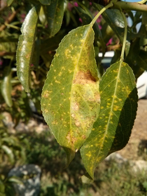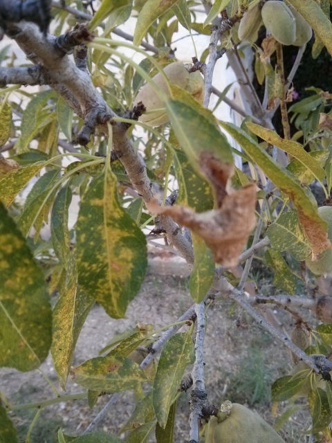 השקד שלנו (נטענו לפני שנתיים) נראה רע מאד: העלים (בכל העץ) התמלאו נקודות צהובות/חומות ומתייבשים. בנוסף לכך כל הפירות נעקצו על ידי צרעת השקד.