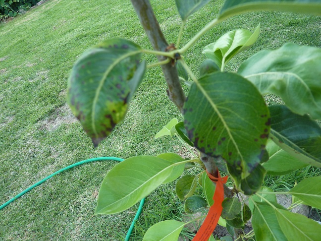 קניתי עץ אגס לפני 3 שבועות. שתלתי ובינתיים אני משקה כל יום בצלחת סביב העץ. אזור ירושלים. רואה שהוא תופס ויש עלים חדשים. אך על העלים הישנים יש כתמים שחורים. ראה תמונות. מה הסיבה? מה לעשות? מניעה?