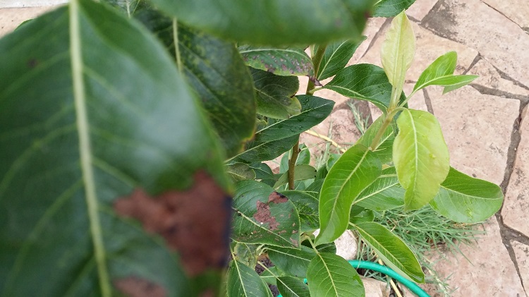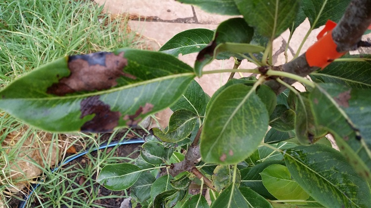 באביב שתלתי עץ אגס. הוא מיתפתח טוב. הבעיה שבעלים הישנים מופיעים כתמים כהים שמתפשטים ומתיבשים.