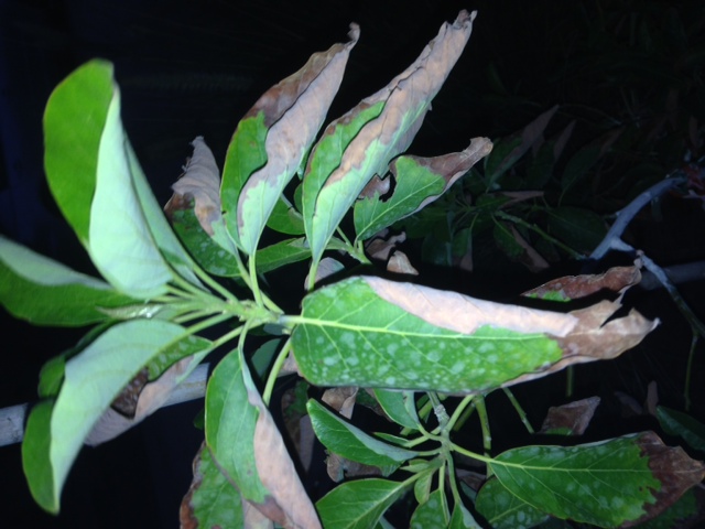 אני גר בעמק בית שאן (חם מאוד 40 מעלות ויותר, בחורף יש קרות אחדות, והאדמה מאוד גירית) האבוקדו נראה רע מאוד, לא גדל, צבעו צהבהב ולא ירוק מבריק כמו שמתאים לאבוקדו, והכי גרוע כל קצוות העלים שרופים. בחלק מהעלים השריפה מגיעה אפילו עד מחצית העלה. מקבל מים בטיפטוף, פעם ביומיים למשך שעה מטפטפות של סך הכל 16 ליטר משמע 8 ליום. האדמה כמעט לא מאפשרת להעלות את כמות המים משום שהניקוז נוראי. כבר בכמות המים הנוכחית לאחר השקיה מתפתחת ביצה.