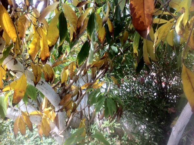 עלים של עץ ליצ'י מצהיבים ועלי קלמנטינה מתקפלים