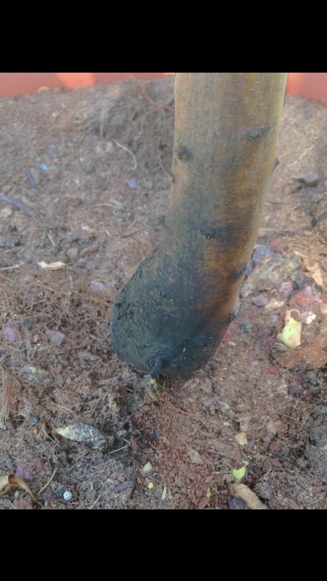 על עץ שקדיה מופיעים סימנים שחורים בפרקי בגזע כמו פייח.