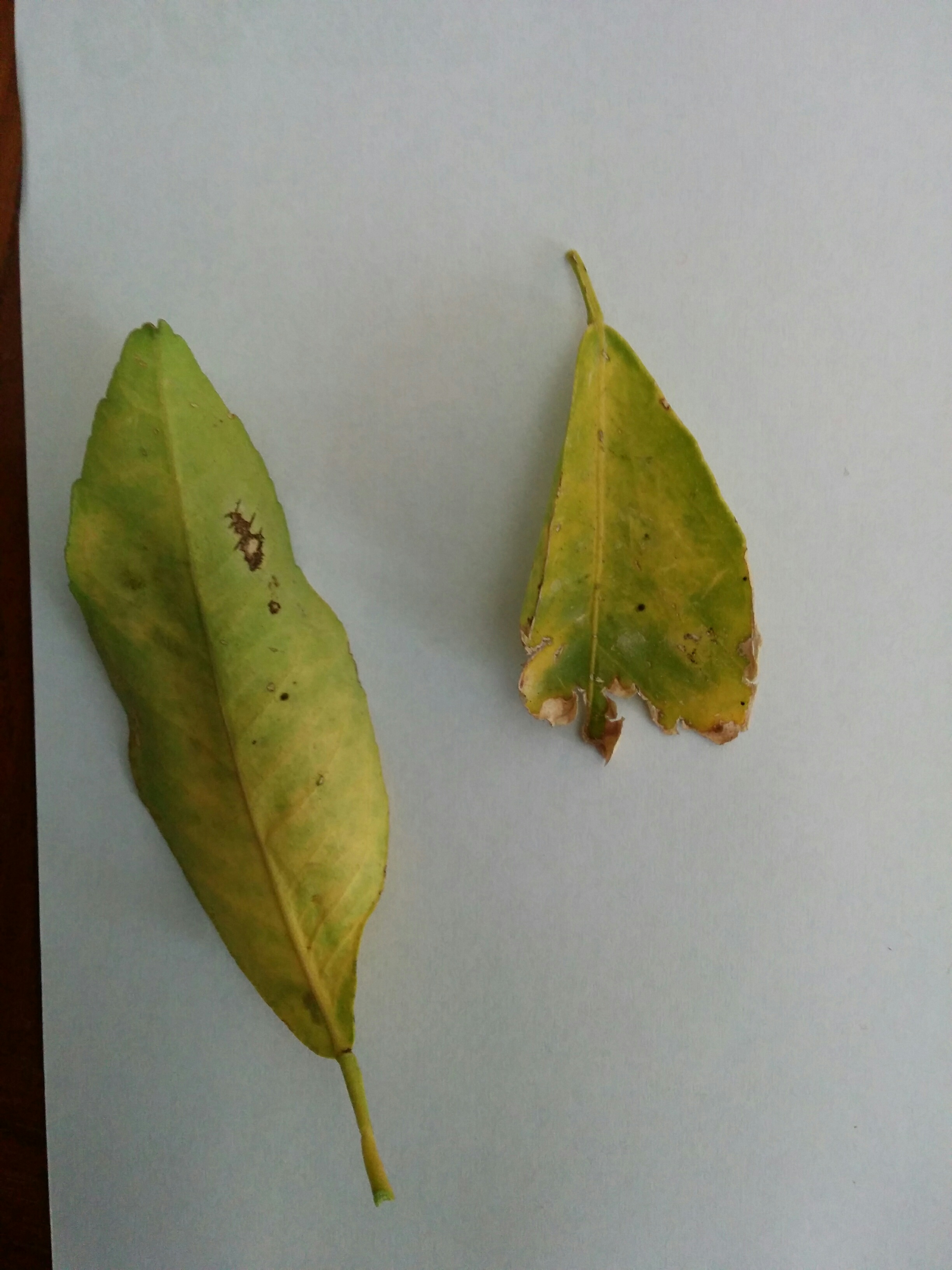 בעץ קלמנטינה ששתלתי בסוף החורף העלים חלקם מתקפלים וחלקם מצהיבים עם סימני מזיקים. צרפתי צילום מקרוב של שני עלים הממחישים את שתי הבעיות. מענפים מסויימים כל העלים נשרו.