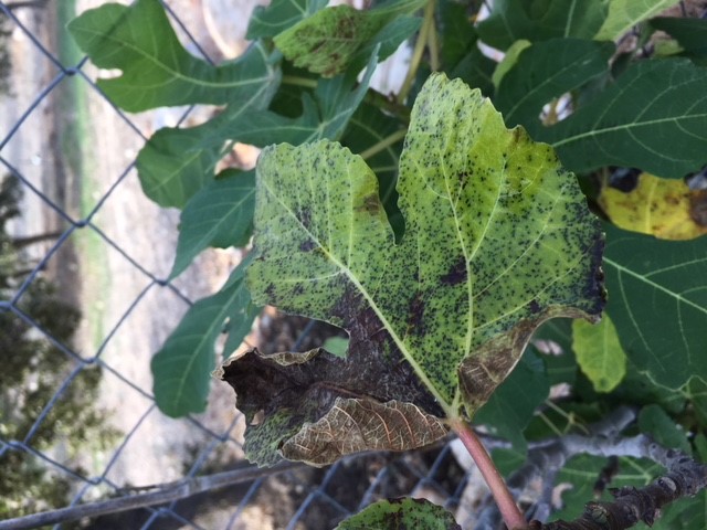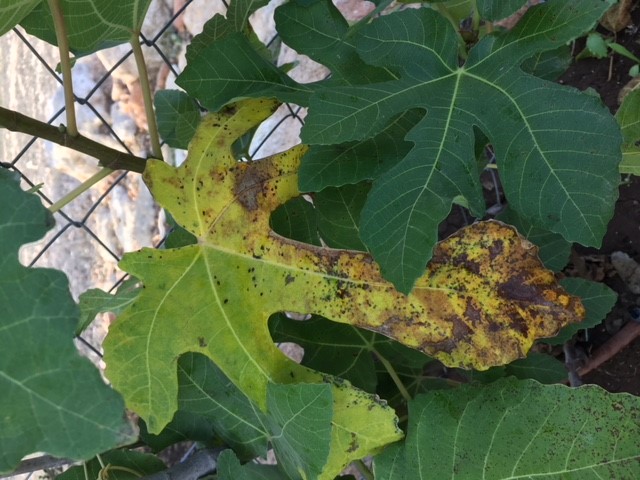 העלים של עץ התאנה בחצר מצהיבים ומשחירים. הקצוות של העלים של עץ התות משחירים גם.