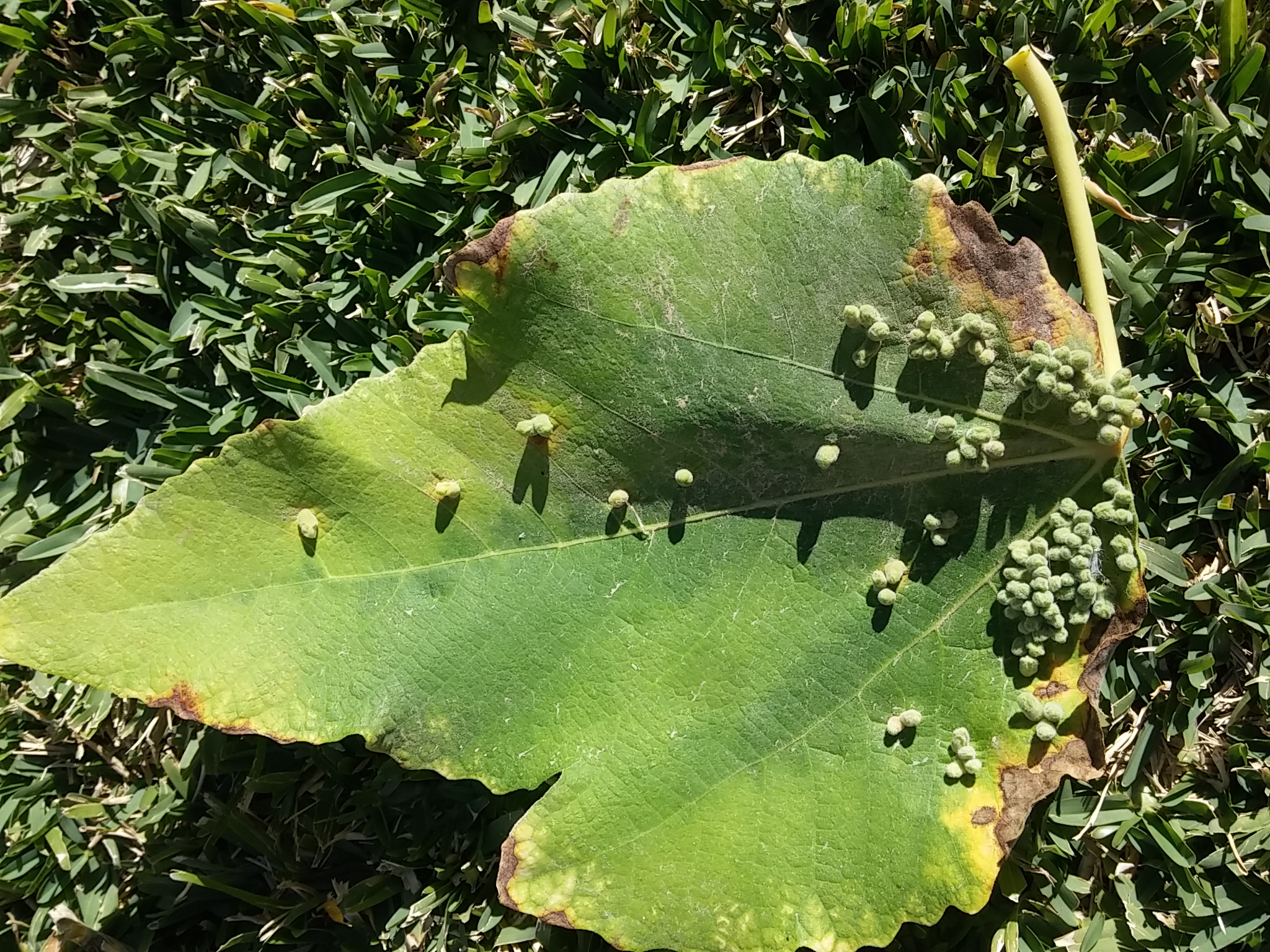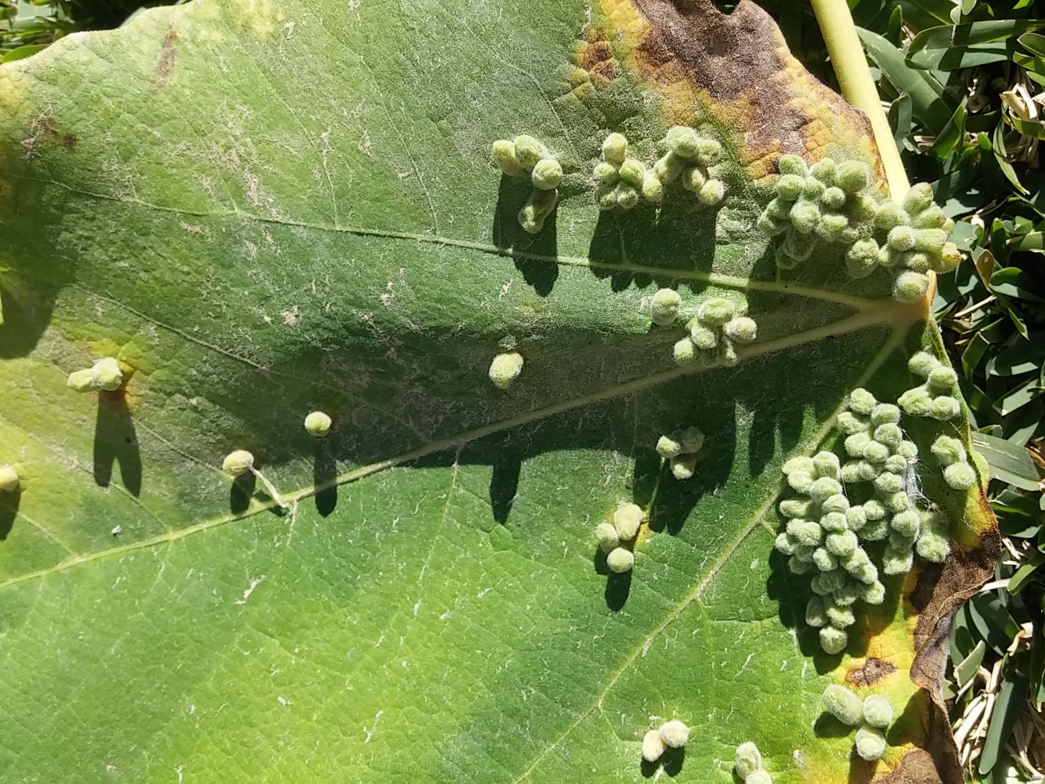 עץ התאנה בחצרי בשיא השלכת. למעשה, רוב עליו נשרו ואלה שלא, ינשרו בקרוב. על חלק מהעלים שעדיין איכשהו נשארו ירוקים גיליתי גידולים מוזרים. כמו גולות ירוקות קטנטנות. צילמתי לשם המחשה. מה זה הדבר הזה?