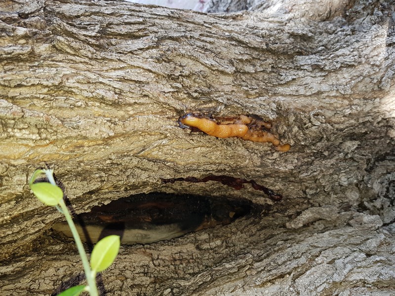 אממה, בבדיקה מדוקדקת מסתבר שהעץ נגוע קשה. ישנם כ20 חורים שמהן ניגר שרף. שני חורים גדולים