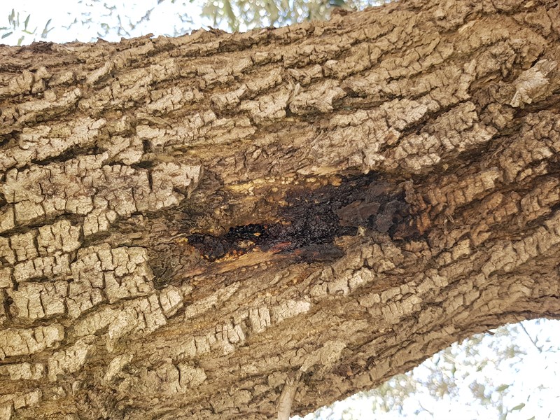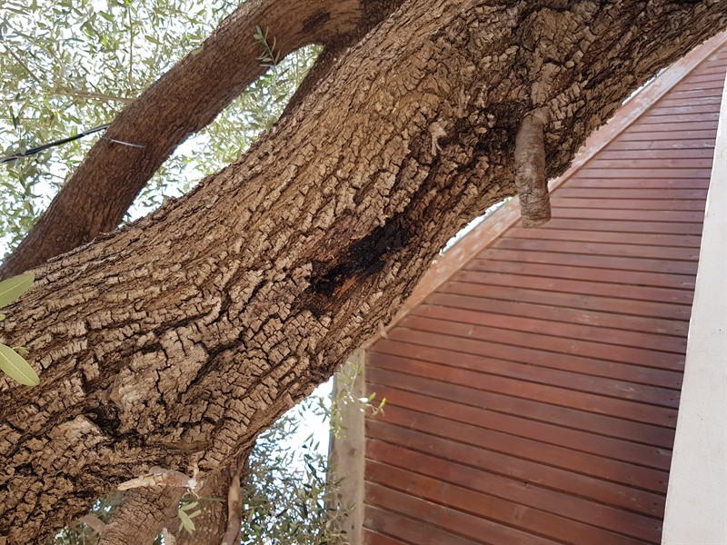 עץ זית חולה, מפריש שרף ומכוסה קליפה..