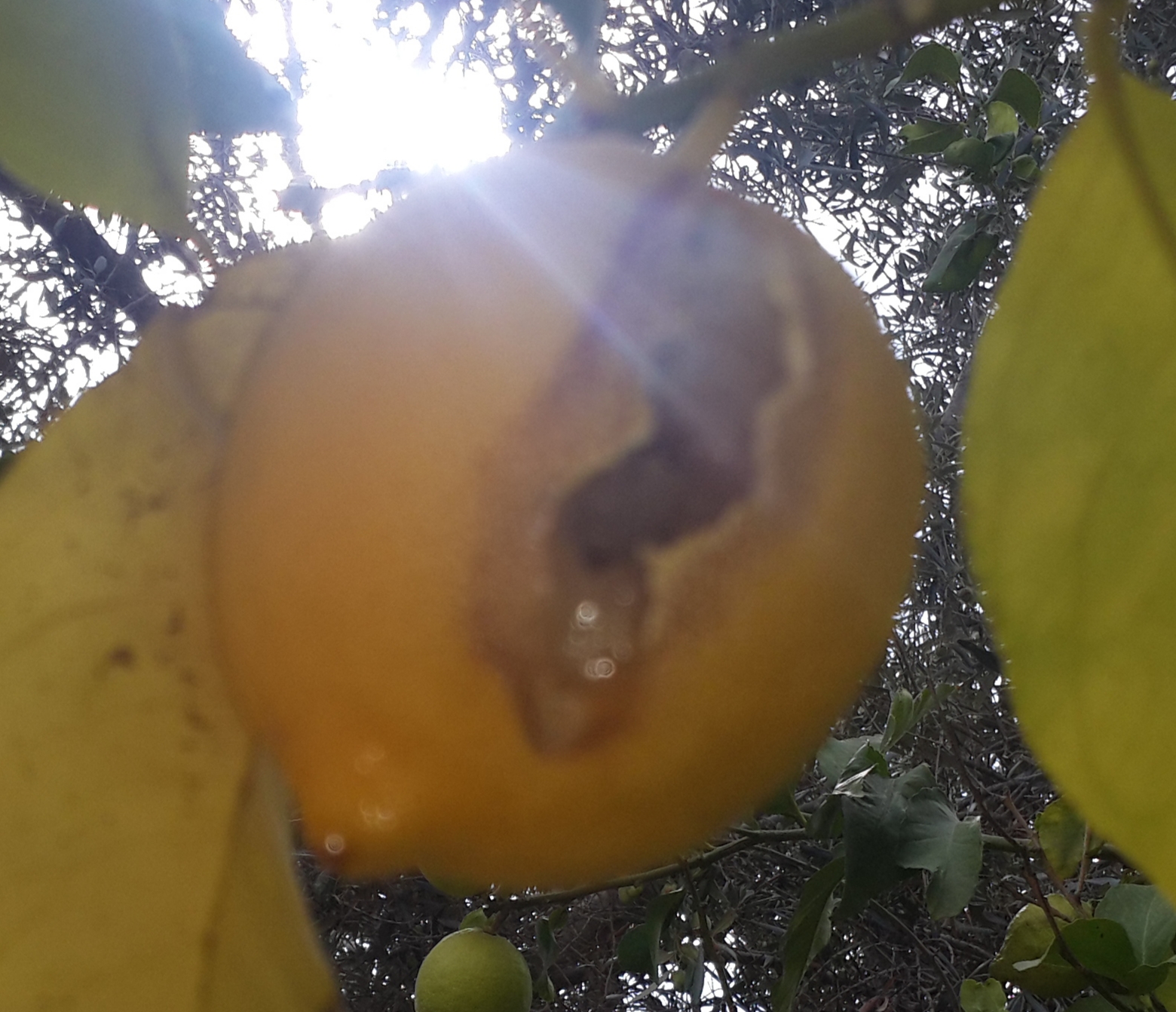 הפירות בעץ הלימון שלי נגועים - נסדקים (בעודם על הענף) ונאכלים מבפנים על ידי חרקים (זבובונים). מצ"ב תמונה. בהמשך הם נושרים.