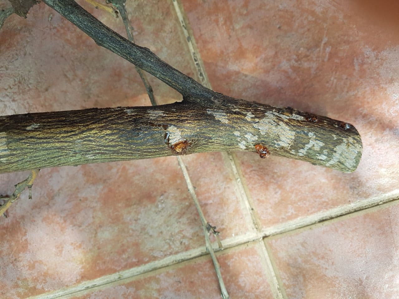יש לנו עץ לימון שבעבר סבל מקרקע לא מנוקזת- לאחר חורף יצא שרף מתחתית הגזע. בינתיים טיפלנו בקרקע וכבר כמה חורפים שהכל בסדר (הקליפה החיצונית של הגזע חסרה במקומות שנפגעו, אבל ההגזע התייבש ולא הייתה הפרשת שרף). כעת שמנו לב שיש שוב הפרשת שרף ותופעה נוספת מדאיגה יותר: אחד הענפים (לא בקרבת הגזע) מת מהמרכז לקצה- בקצהו עדיין ירוק ולימונים קטנים, אבל רואים שכל העסק מת. יש גם כתמים אפרפרים על הענף.