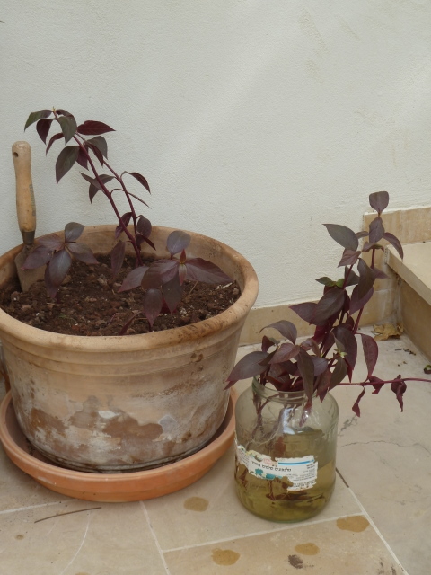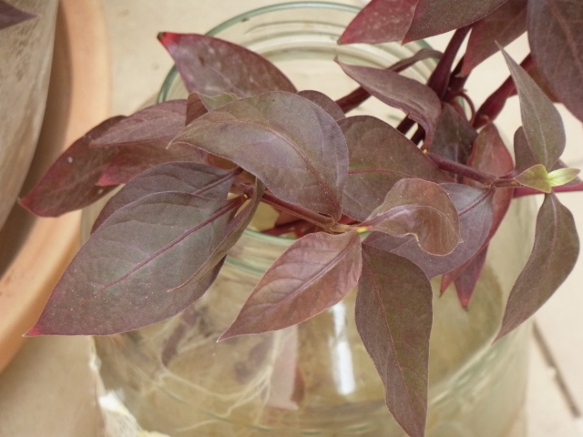 השרשתי ענפים שגזמתי משיח ברחוב. שיח לא צפוף בגובה כמטר. עלים אדומים-סגולים. לא ראיתי את הפריחה.