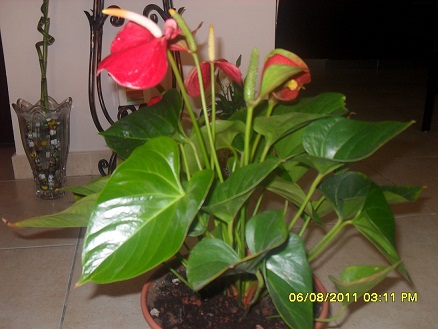 האמצעי נקרא אנתוריון. לא נראה כסובל,אבל רגיש להשקייה בלתי נכונה.גם הלבן שבחבורה שקרוי ספטיפילום סובל אם סובל מאותה בעיה.השקייה לא נכונה. שימו שאיני מתכוון לכמות או לתכיפות הגשת המים. יש להשקותם עד רוויה כל פעם שמקבלים מיים. את המים שיוצאים לצלחת (חשוב שייצאו מים לצלחת) יש לסלק אחרי רבע שעה בערך.