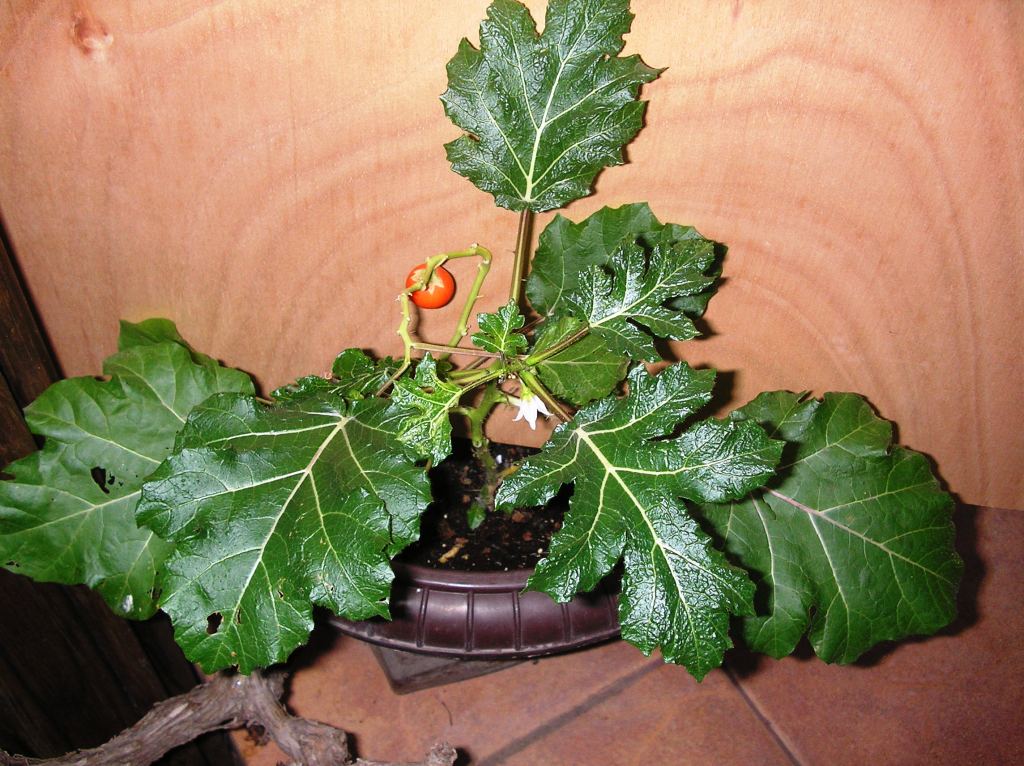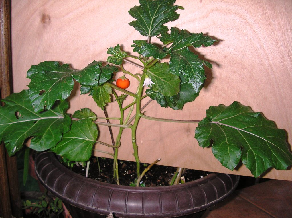 הצמח גדל בעציץ ואף הוציא פרחים והפרי שנוצר קטן ועגול בצבע כתום