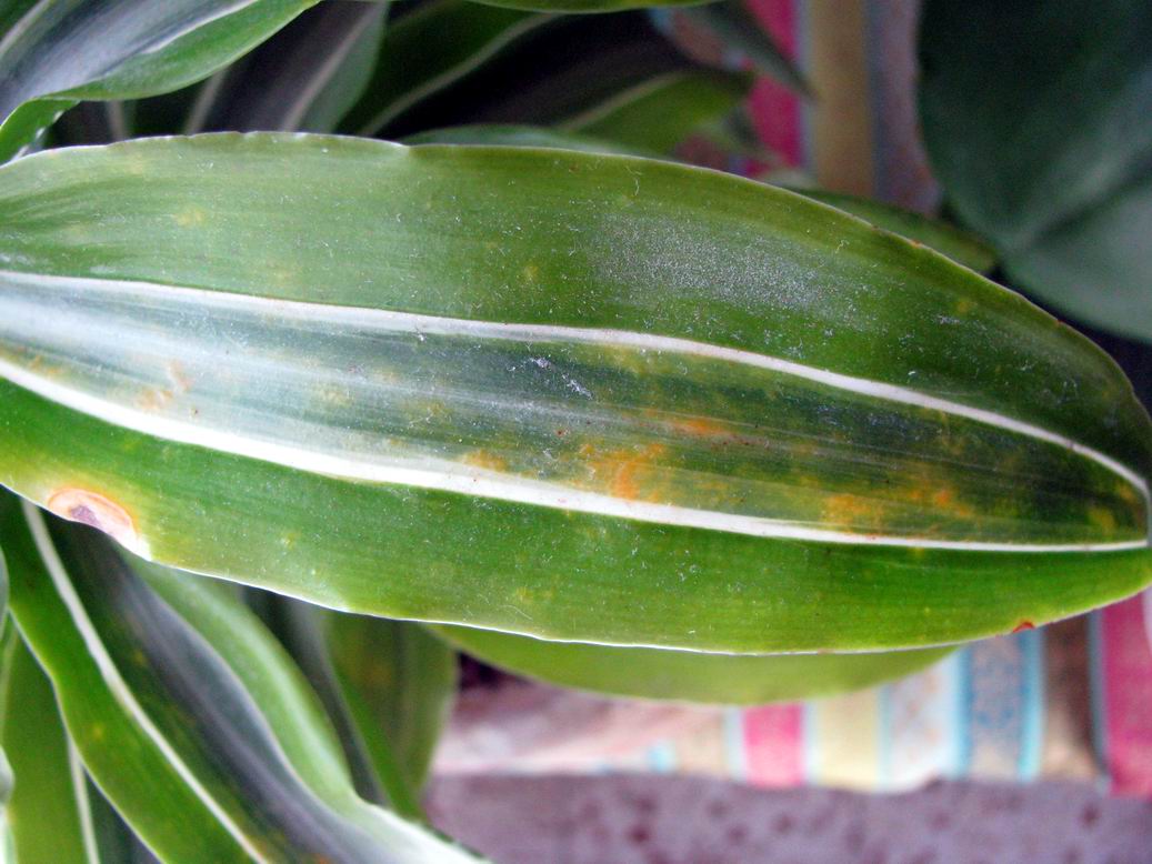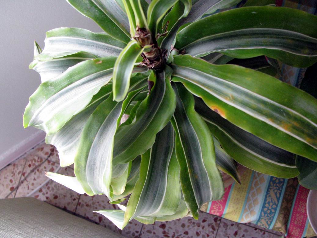 הצמח השני, שלא ידוע לי שמו (מהו?) - העלים מקבלים כתמים חומים כאלו. הוא היה בביתי ליד החלון, העברתי לצל לכמה חודשים ואז חזרה לאור - לא עזר דבר. העלים החדשים שהוא מצמיח למעלה הופכים במהרה לשחורים.