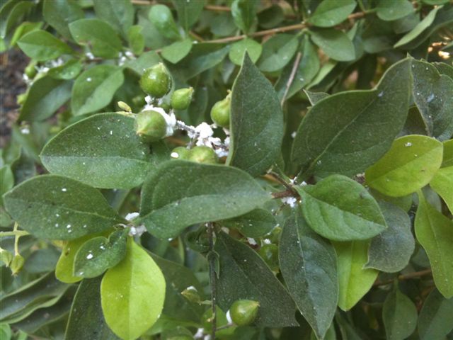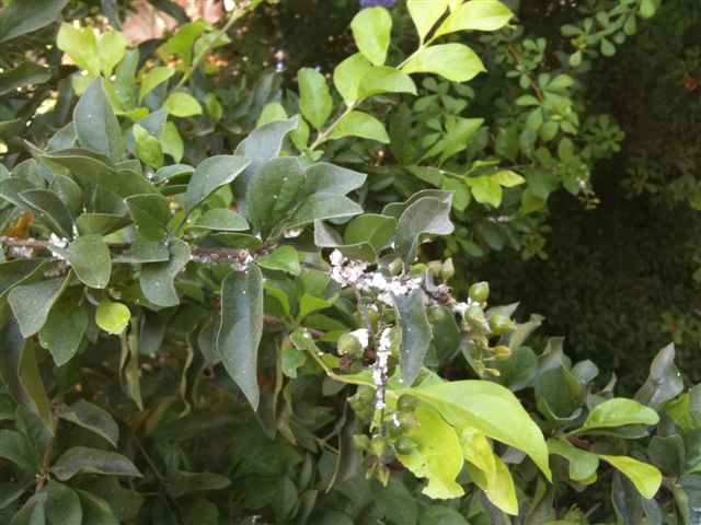 יש לי בחצר שיח דורנטה מצויה שבכל קצה ענפיו נוצרים גבישים לבנים שסביבם נמלים רבות, :( תמונות מצורפות.