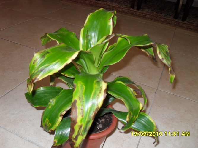 הצמח האחרון הוא אחד מזני הדרקונית (Dracaena deremensis), אולי הזן 'למון ליים'. מצבו רע מאוד ויש לי ספק גדול אם ניתן להצילו. נפגע על ידי מחלת ריקבון השורש, קרוב לודאי עקב השקית יתר. צמח זה משקים רק מעת לעת כאשר פני המצע (עד לעומק של מפרק אחד של האצבע) חשים יבשים. השקיה רק במים רכים (מים מזוקקים, מי מזגן לאחר שהגיעו לטמפ' החדר, או מי גשמים). סלקי את הצמח עם העציץ, או סלקי את הצמח ואת העציץ רחצי היטב וחטאי באקונומיקה לפני שימוש חוזר. רכשי צמח חדש והקפידי על הוראות הטיפול הנלוות אליו.