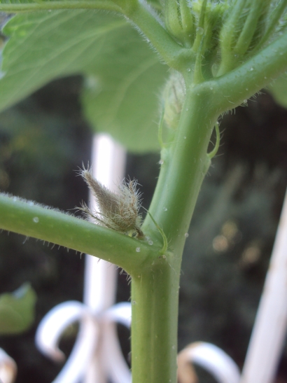 העלים גדולים מאוד ויש ניצנים של פרחים, בניגוד לשאר שני צמחי הבמיה שיש לי עליהם את כנימת עש הטבק.