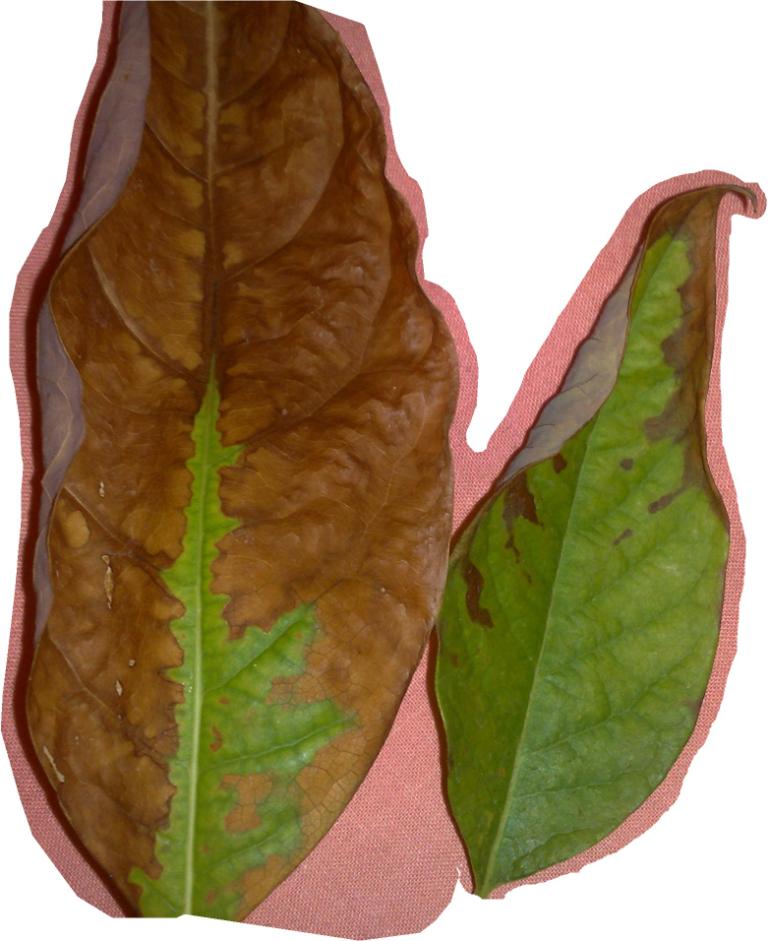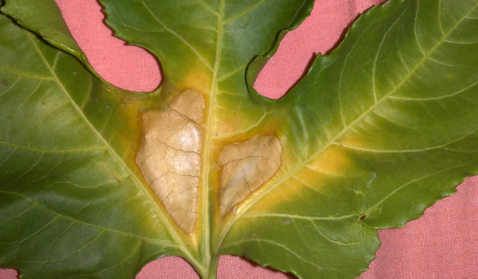 1. 2 צמחי פסיפלורה יחסית סמוכים האחד נראה בינתיים בסדר האחר חיוור , עליו מבהירים ומצהיבים במרכז על חלקם כתמים.