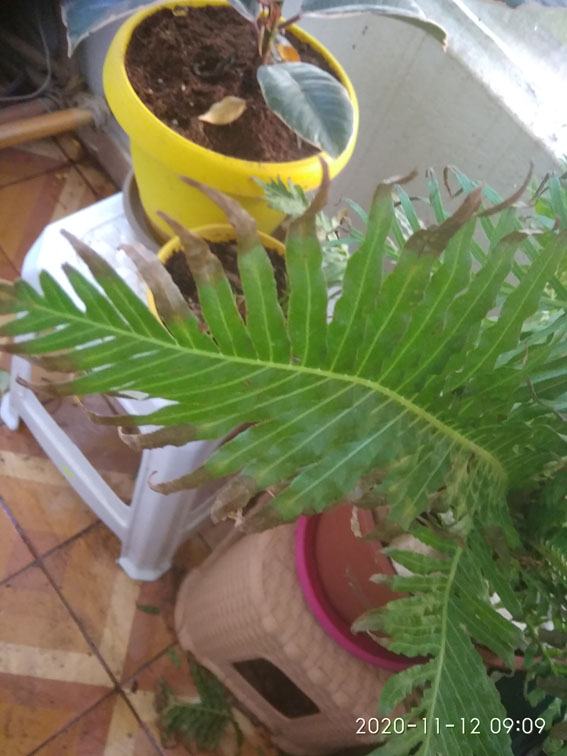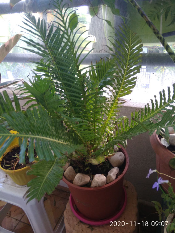 בשרך מפותח מסוג פלכון הניצב במרפסת צפונית עם שרכים אחרים. בסביבה לחה ובהשקיה מתונה עד רבה התחילו כל קצות העלים להתיבש